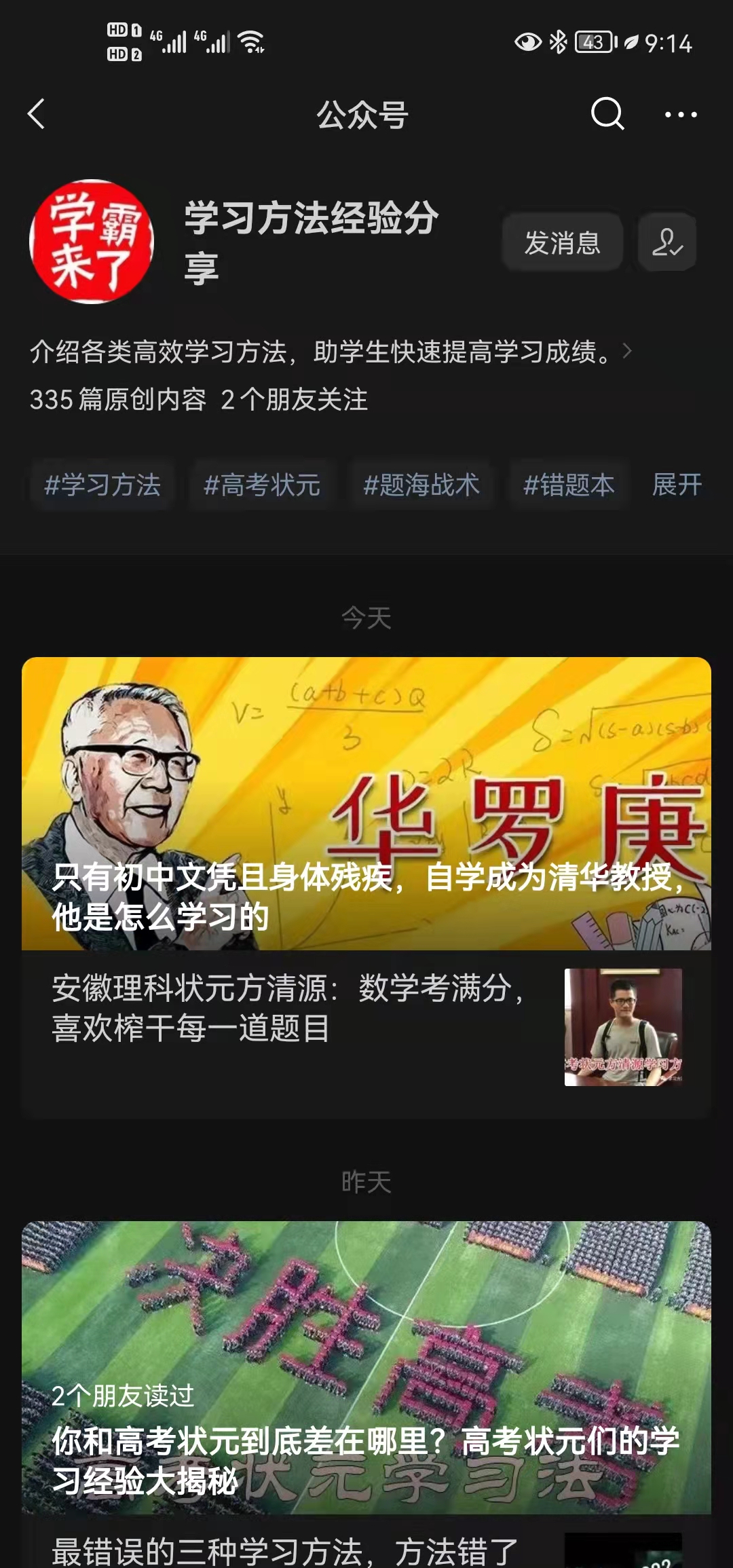 如果你感覺自己的學(xué)習(xí)方法特別低效,可以關(guān)注一下這個(gè)微信公眾號(hào),每天認(rèn)真讀一下上面的學(xué)習(xí)經(jīng)驗(yàn),也不用全部照搬,只需要找到最適合自己的方法就可以了。